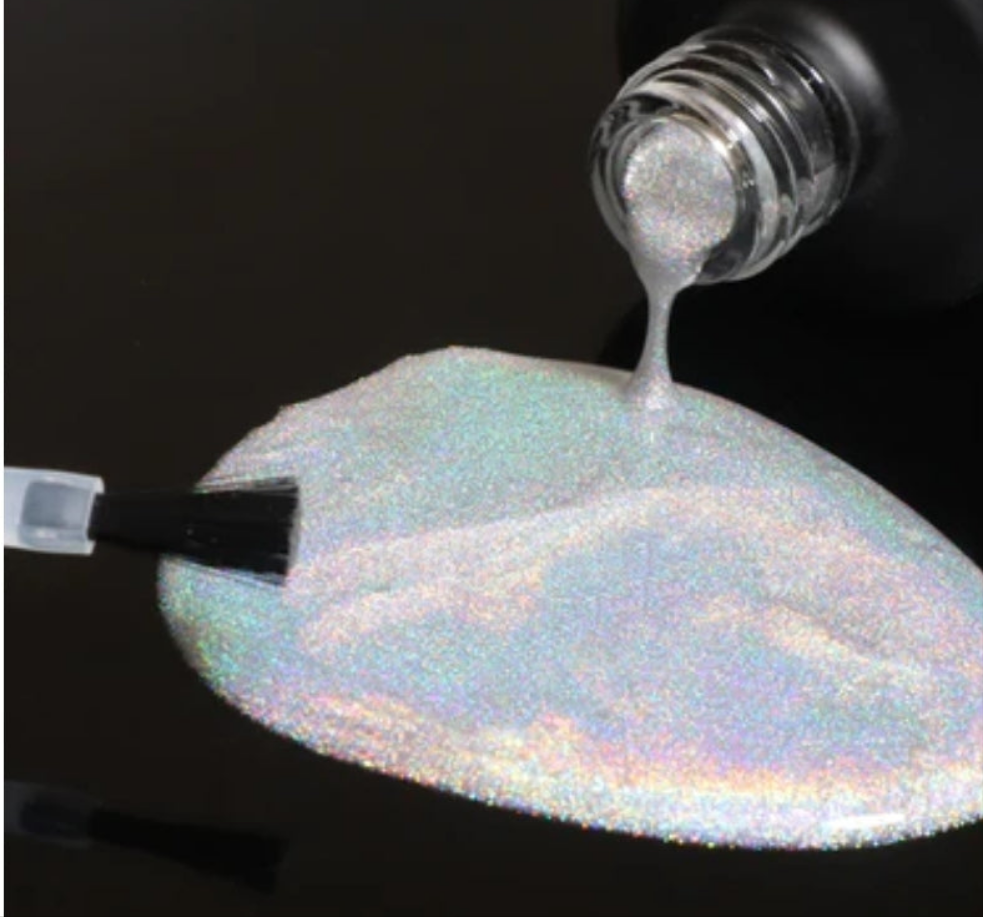 A clear gel polish packed with holographic cat eye pigment that can be applied over the top of any color to add a stunning rainbow cat eye effect to any color.