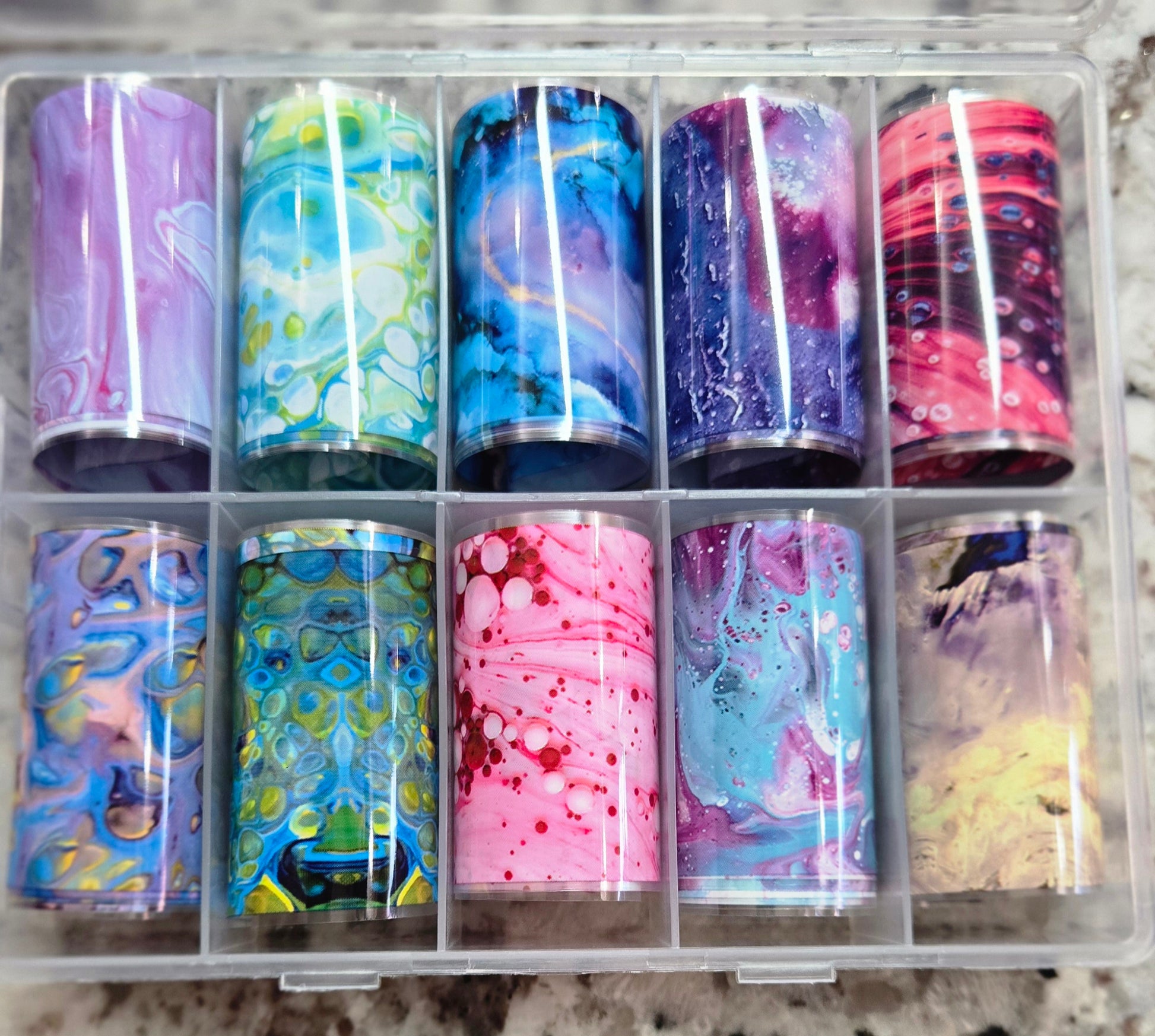 Enhance your manicure with Oil Slick Foils. Use as an accent or for full glam on all nails. Achieve a flawless application with our Nailchemy Foil Glue. Elevate your nail game with this must-have accessory.